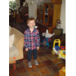 Juf Marian is in de toiletten bezig met peuters, ze vertelt dat Bart nog aan tafel zit omdat hij zijn melk nog moest opdrinken, maar zegt nu dat dat niet hoeft omdat hij niet zo lekker is. Als ik het lokaal in kom, zit Bart in z'n eentje aan tafel, lege beker voor zich maar als hij opstaat is z'n hele broek nat: "was ik vergeten te zeggen". (?????, of niet durfde omdat hij niet van tafel mocht??). Geeft niks, gewoon een ongelukje, we gaan droge kleren aan doen. Een andere juf komt direct aanlopen, pakt droge kleren en verschoont hem, ze vindt het ook niet erg, "ja kan gebeuren hè?", Bart vindt het toch nog een beetje eng maar we stellen hem gerust. De juf vertelt verder dat hij sinds de gymles een naar hoestje heeft, geloof ik graag want hij piept flink en hoest steeds, heeft ook een warm hoofd. Met Karel's uitdeeltasje naar de auto. Onderweg krijgt Bart een flinke hoestbui en zit daarna naar adem te snakken, mannetje-mannetje.
