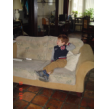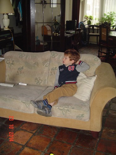 Afgelopen en nu hebben we een conflict: "NEEEE ik wil niet liggen!!!", dat hadden we afgesproken Bart, en daarna bob de bouwer kijken, "NEEEE ik wil niet!!!!!". Bart draait weer door, ik laat hem even betijen op de bank en ga m'n mail checken. Na 10 min. gaat baas sneaky-creepy op het kleed zitten. Ik til hem op en leg hem op de bank, blijf ernaast zitten, baas zet 30 sec. een enorme keel op, maar dat vindt hij al gauw veel te veel moeite en is stil. Ligt soezerig sesamstraat te kijken, zucht en geeuwt. Ik doe tv uit, zet muziek op en ga in de stoel zitten, Bart kijkt dromerig naar de wuivende bomen buiten en grijnst me af en toe vriendelijk toe. Blijft wel vechten tegen de afgang van het in slaap vallen. Ook goed.