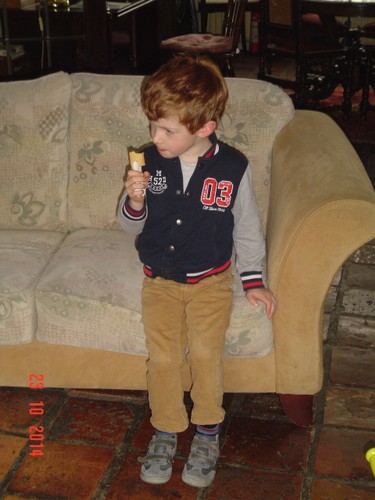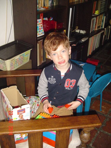Tuin in, Bart helpt eerst mee met bollen planten onder de heg, dan gaat hij "onkruidjes plukken" en door de tuin banjeren. Na een ½ uurtje: "ik heb poep" en ja hoor, kattepoep aan z'n hand, op z'n jas en laarzen. Gatsie!!! Naar binnen en alles schoonmaken en ik mopper: snertkat! Bart: "och oma toch (onder het poetsen:) mijn broek is dezelfde kleur als de kattepoep", ja lekker, broek goed nakijken maar die is schoon. Jas even drogen en snottebel afvegen: "ik pak tissues wel dan hoef jij niet zo ver te bukken, ik help jou altijd een beetje". Ik ga verder laarzen schoonmaken, Bart speelt met kassa, duplo en spanbanden. Bart wil niet meer de tuin in dus ik ga gauw laatste bolletjes planten en opruimen. Als ik weer binnenkom, is hij met de moeilijke kaarten van electro bezig. Even mandarijn en laatste zoete appeltje uit de tuin, "we moeten de spin nog eten (ik griezel een beetje), eet jij het blaadje van de spin en ik de spin, is dat goed? gaan we samen delen, ik pak de spin wel", baas is zorgzaam.