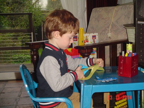 Pakt zelf spullen en gaat knippen/tekenen, als dat af is pakt hij de pomp en gaan we een experiment doen: papiertje op de slang en kijken hoever hij dat de lucht in kan pompen. Krijgt er geen genoeg van.