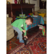 weer springen en op het kleed met z'n hoofd heen en weer schudden.