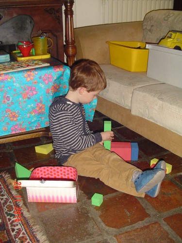 gaat in 1x op. Verder spelen met blokken, Bart bouwt een kasteel.