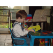glitterkunstwerk maken voor papa en mama, is zo geconcentreerd bezig