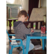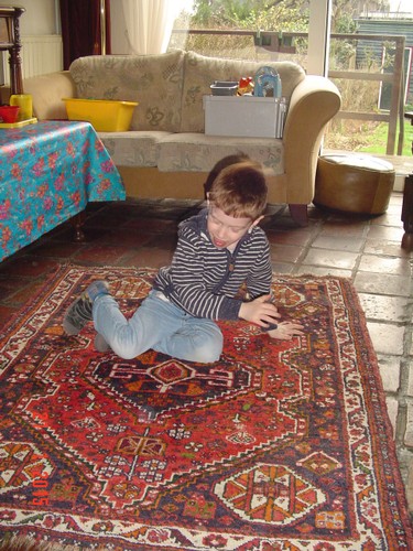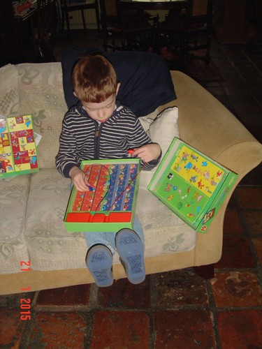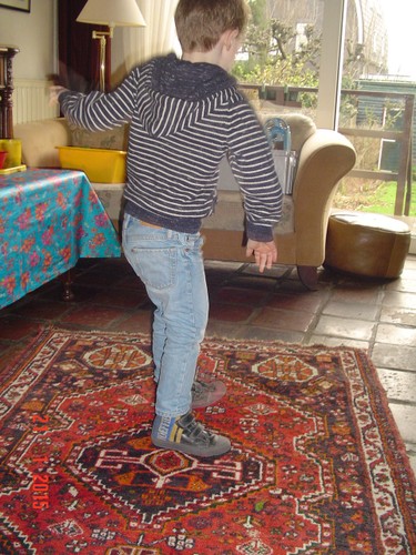 Mikkie mouse kijken, daarna spelen we samen sesamstraat-domino, na 4 spelletjes: "zullen we nu een ander moeilijk spelletje doen?", wat dan? "zal ik je wel laten zien". Bart pakt de electro uit de kast, samen op de bank een kwartier bezig. Ook de moeilijke kaartjes gaan prima, Bart heeft alleen moeite om linker- en rechterhand tegelijk aan te sturen, waardoor het lampje niet altijd gaat branden. Even sap opdrinken, "nu wil ik nijlpaard prikken", maar hij is nog geen minuut bezig of: "ik wil eerst memory spelen met jou". We doen 3 spelletjes, maar Bart is weer onrustig, kruipt heen en weer op het kleed, gooit de kaartjes op andere plekken, let niet op, kletst van de hak op de tak, pfff - ongeleid projectiel.