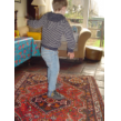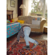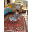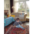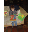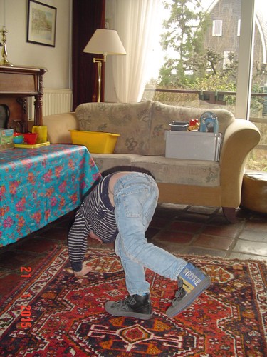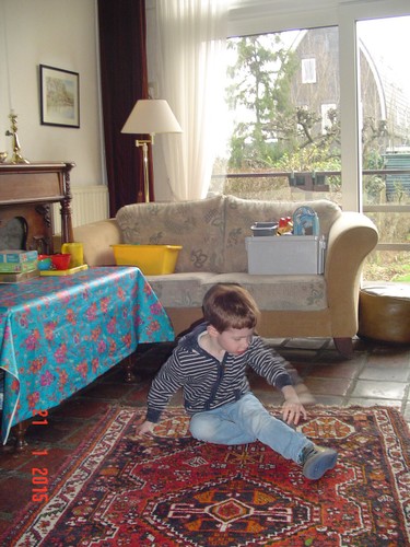 "Ik heb weer honger", koekjes halen en naast me opeten: "als er een stroomstoring is, en als je avondeten eet, dan wordt het helemaal donker . . . hoe heette jouw papa? . . papa's collega die heet Chris . . en een collega van opa heet ook Chris . . er zijn een heleboel Chrissen in het land . . . waterlelies gaan vannacht open (???) ja, dat doen ze . . ." enz.enz. Koekjes op en weer op het kleed raggen, pakt ineens een tipboek en als dat uit is weer draaien, springen, rollen op het kleed en maar kletsen.
