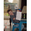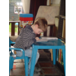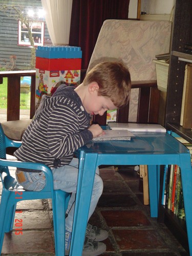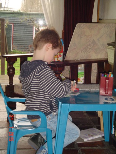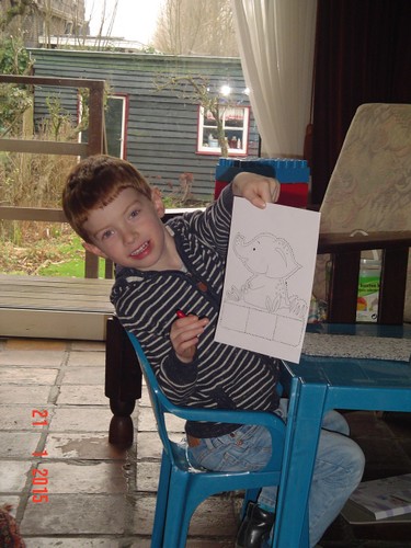 Onderweg kletst Bart van de hak op de tak: "papa heeft soms hoofdpijn . . daar heeft hij pilletjes voor . . dan neemt hij een pilletje en dat gaat naar het stukje hoofd dat pijn doet . . en dan gaat het over . . . . in dat huis is brand geweest . . het is een klein huis . . van hout . . daar achter ons . . het is een wit huis . . en nu kan niemand er meer wonen . . . jammer hè? . . ", enz. enz. enz. Thuis eerst tip de muis en bibbeltje kijken, dan gaat baas raggen op het kleed: "zag je hoe ik omrol . . ik ga ondersteboven . . zag je dat?" Ik laat hem maar even uitrazen, dan valt hij hard op z'n billen, "AU!", tja dat hoort erbij, moet er een kus op? "nee hoor, is niet erg", Bart wrijft over z'n billen: "nou heb ik eerst honger". Juist, koekjes en sap halen, smikkelen en kletsen: "is mikkie mous er niet?" nee, vandaag niet, wil je je prikwerk niet afmaken? "Jaaaa! mijn olifant prikken". Hij gaat onrustig aan de slag, steeds opstaan, kletsen, met z'n stoel wippen, priklijntjes zijn een beetje krom. Als je je olifant af hebt, kunnen we een mikkie mouse dvd kijken, "kan nu ook wel even", nee eerst je werk afmaken, dan mag je kijken. Bart prikt onrustig verder, steeds even stoppen om te kletsen: "dit schoolwerk is makkelijk . . . is een makkie". Duidelijk, coördinatie is nu niet meer het hoofddoel, maar de concentratie en daar heeft baas veel moeite mee vandaag. Prikt onrustig door tot hij tegen z'n pink prikt: "AU . . . geen bloed, is niet erg hoor, is niet erg. . nee hoeft geen kus op, is niet erg". Gelukkig maar, zie je dat het best moeilijk is om precies te doen? Vanaf nu is Bart een stuk rustiger, kletst nauwelijks meer en wipt niet meer met z'n stoel, is 10 geconcentreerd bezig. "Klaar oma . . nu ga ik kleuren . . als mijn olifant af is, ga ik mijn nijlpaard prikken". Bart geeft z'n olifant een blauwe kleur en probeert binnen de lijntjes te blijven maar schiet af en toe uit, heeft veel moeite met de pengrip, ik probeer het te corrigeren. "Klaar oma!" Prachtig! we zetten het prikwerk in de boekenkast.