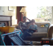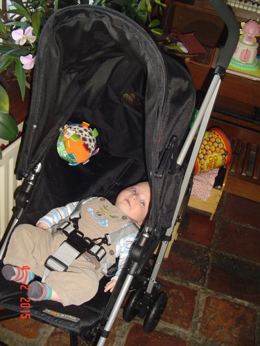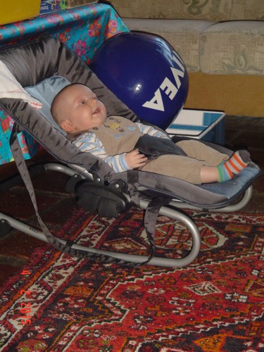 Chris in de wipstoel waar hij tevreden ligt rond te kijken en te
