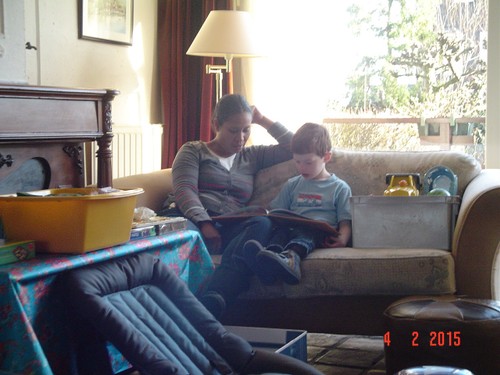 keuken. We wachten op de bank tot mama er is, Bart knabbelt koekjes,