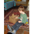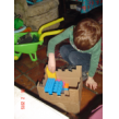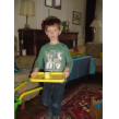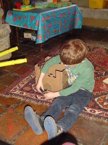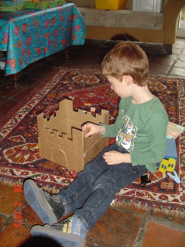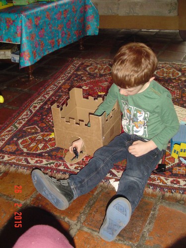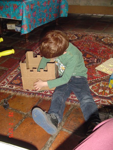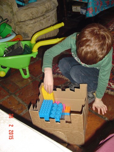 Door de regen naar huis, bah snertweer! Op tijd thuis voor tip en bibbeltje, dan kijken we even op buienradar, nee voorlopig is het nog niet droog. Dan ga ik maar even een kasteel van een kartonnen doos maken, Bart geeft aanwijzingen en: "je mag mijn schaar ook wel even lenen hoor!" Al gauw klaar, baas pakt z'n ridder en legopaarden en speelt met z'n kasteel, bouwt er ook trappen in van legoblokken.