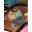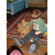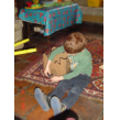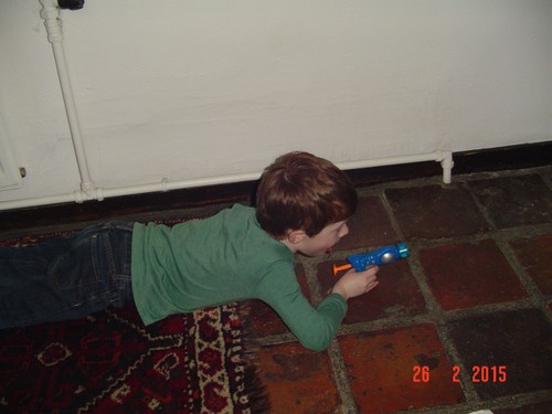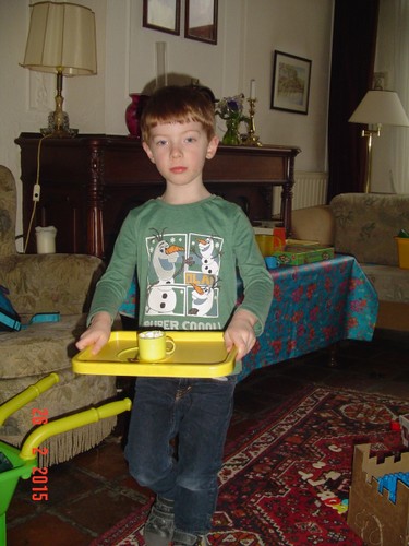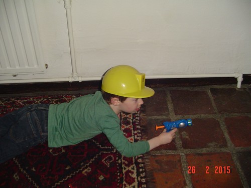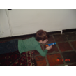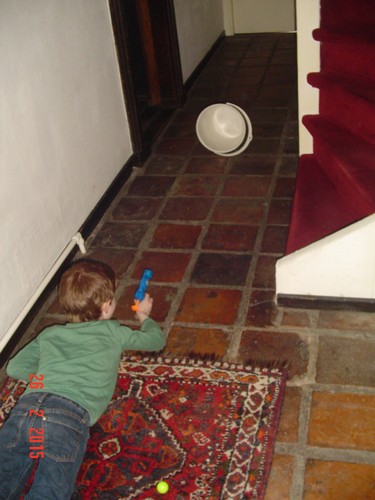 Bart gaat even schieten in de hal, probeert balletje in de emmer te krijgen: "ik besloot dat ik een helm op zal zetten". Even pauze voor yogho en koekjes en dan kijken we foto's van tante Roos toen ze politie-agent was: "ging ze hard rijden . . met sirene? . . ging ze dieven vangen? . . had ze ook een pistool? . . ging ze ook schieten? . . ". Dan spelen we nog een bob-spelletje: gereedschap opruimen. Bart wijst aan en ik bedien de muis. Spelletje afgelopen en Bart serveert me weer koffie met suiker.