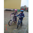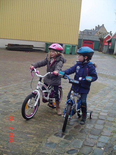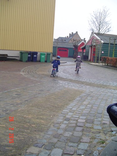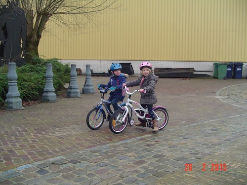 Het is droog!!! Gauw naar buiten, fiets pakken en lekker racen, wel een koude wind. Af en toe een hoestbui. "Is Senne er niet?", geen idee, ik heb haar nog niet gezien, misschien is ze wel met vakantie. Bart kijkt regelmatig even door het hek of hij iemand ziet en laat z'n sirene loeien. Na een ½ uurtje komt buurman naar buiten, Senne had Bart gehoord en wil nu ook fietsen, ze komt eraan. Bewondert z'n politiefiets met sirene en Bart babbelt er lustig op los. Glundert wanneer 'prinses' naar buiten komt. Samen fietsen, af en toe even stilstaan om bij te kletsen, Senne vindt z'n fiets heel mooi en mag ook even de sirene uitproberen. Dan verdwijnt Senne achter haar oma's huis en daar mag Bart niet komen, hij schreeuwt z'n longen uit z'n lijf: "SENNE!!!! SENNE!!! WAAR BEN JE????". Dametje vindt dat wel leuk en verdwijnt dus steeds even met haar fiets, jent Bart een beetje. Ga maar lekker fietsen Bart, ze komt vanzelf wel weer. Daar is 'prinses' weer, je vindt het geloof ik wel leuk hè als Bart je steeds roept. 'Ja, ik ga me dan verstoppen', maar Bart kan jou niet zoeken, want daar mag hij niet komen. 'Waarom niet?' omdat daar het terrein van de buren is, jij gaat toch ook niet zomaar in Bart z'n tuin spelen? Ze snapt het en samen racen ze verder, tijdens een kletspauze laat Senne zien dat ze aan het wisselen is, Bart is zeer geïnteresseerd: "is het lastig om te eten als je 2 tanden mist?"