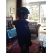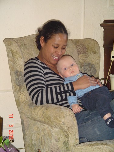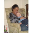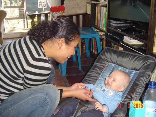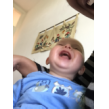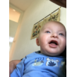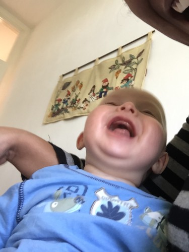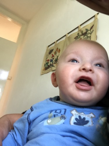 mij op schoot, ligt rond te kijken en te grijnzen, ineens weer een
