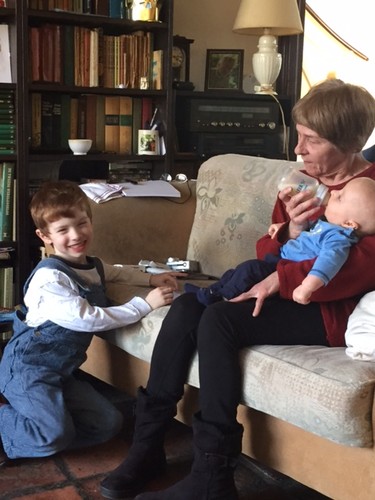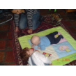op schoot, Bart scharrelt met z'n speelgoed, ik ga gauw fles maken.