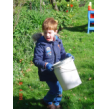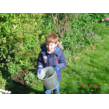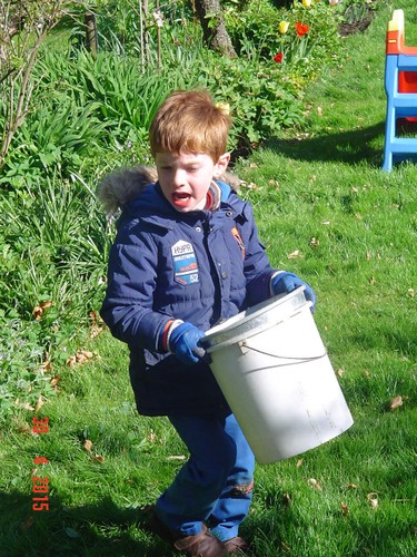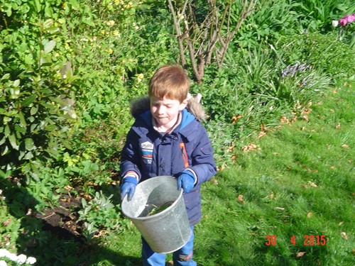 gauw gaat hij onkruid verzamelen in de emmer en in de groene kit