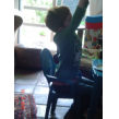 wipt met z'n stoel, zwabbert met z'n armen, kletst ondertussen veel.