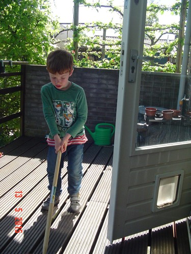 wil geen koekjes of een mandarijn. Even z'n bezem uitproberen op het