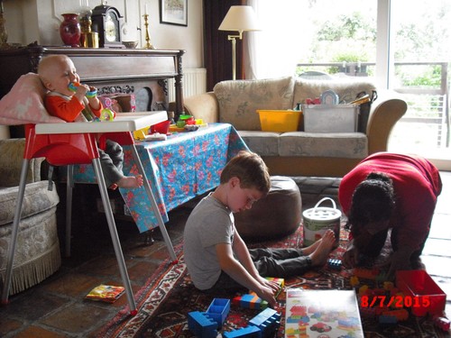 pantoffels aan, ze passen nog net. Dan met tR spelen met blokken. Na