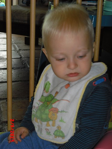 Chris in de kinderstoel eet z'n boterham verder op, speelt met
