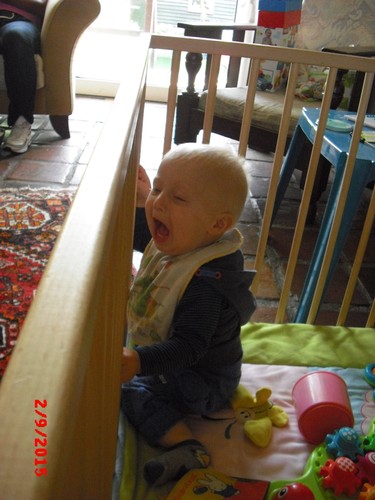 armen uit en protesteert hevig: wil bij papa op schoot en wel NU!