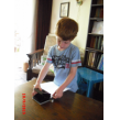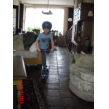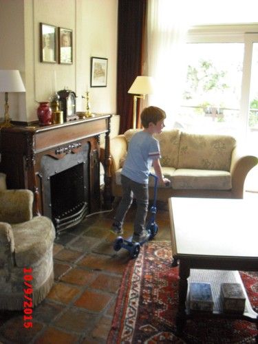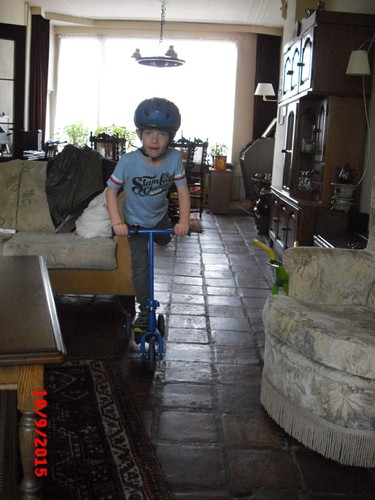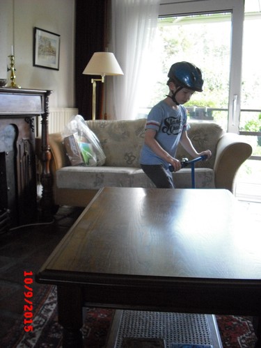 steppen in de kamer: "kijk-es wat ik kan , , op 1 wiel".
