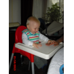 stoel. Met z'n vieren eten, Bart is stuiterig, moeite met rustig