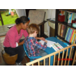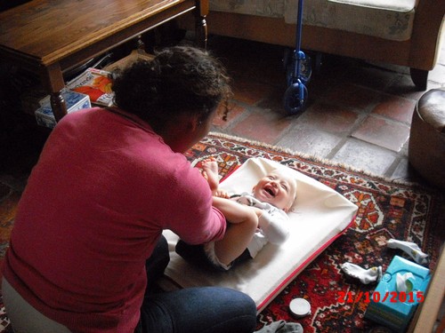 een snoepje als troost. Chris heeft een schone luier en wordt