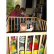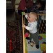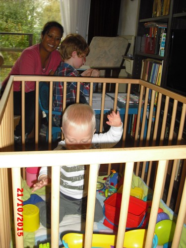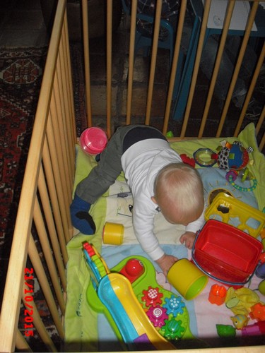 - maba". Pap op en in de box, verder spelen met z'n ballenbaan,