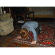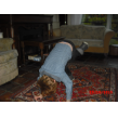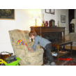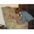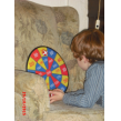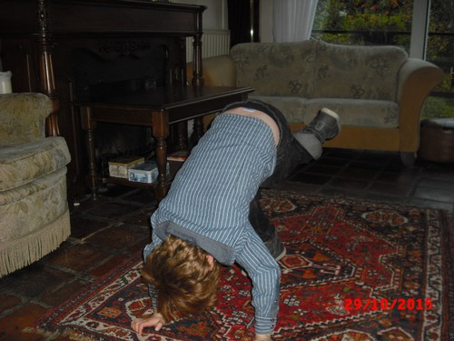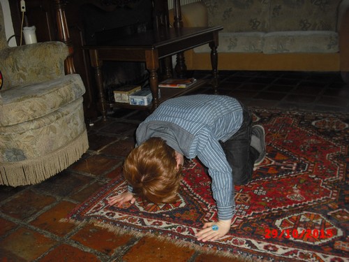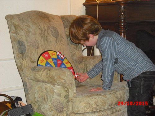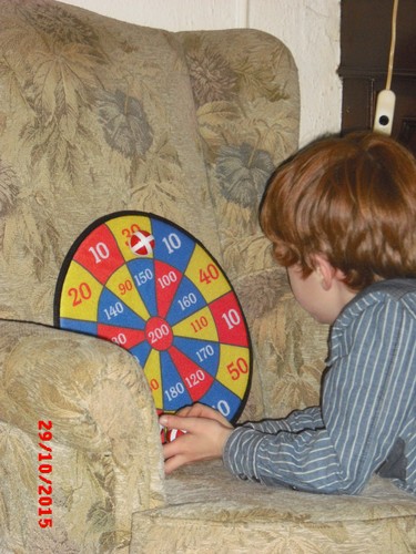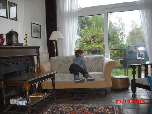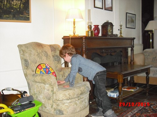 Thuis, Bart gaat direct darten en de getallen noemen, daarna drinken, koekje eten en babbelen op de bank. Kijkt weer met een scheef oog naar de tablet in de boekenkast: "we kunnen wel even een spelletje spelen". Vooruit maar, een ½ uurtje boerderijspelletje op de tablet, dan vind ik het genoeg. Nu even wat anders doen, maar Bart weet weer niks te bedenken, wil geen tekening maken of iets plakken voor de verjaardag van de juf, wil eigenlijk niks, alleen maar tablet-spelletjes maar dat doen we dus niet! Eerst maar een banaan eten en dan gaat hij 'koprollen' oefenen op het kleed en weer 'vliegen' op de banken: "zag je dat? ik maakte een salto". Na 10 min. is hij uitgeraasd en een beetje buiten adem en gaat weer darten, ik moet weer de scores opschrijven: "dertig . . honderdzestig . . honderd . . ". Na 15 min.: "ik heb weer honger", dus nog een koekje en een beker diksap, babbelen op de bank. Dan is het al weer tijd.