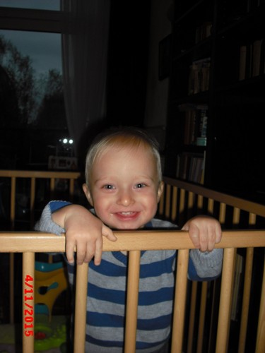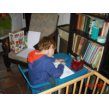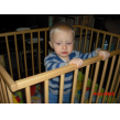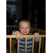 beetje te spartelen: genoeg van geknuffel dus in de box, speelt een