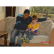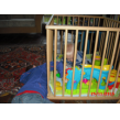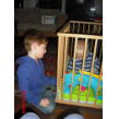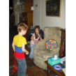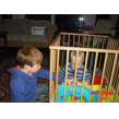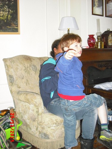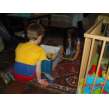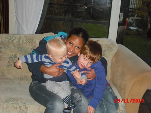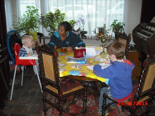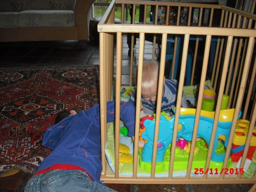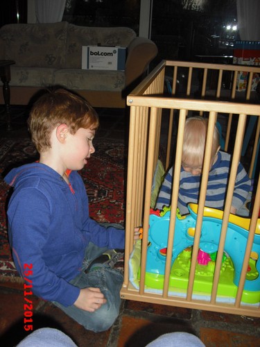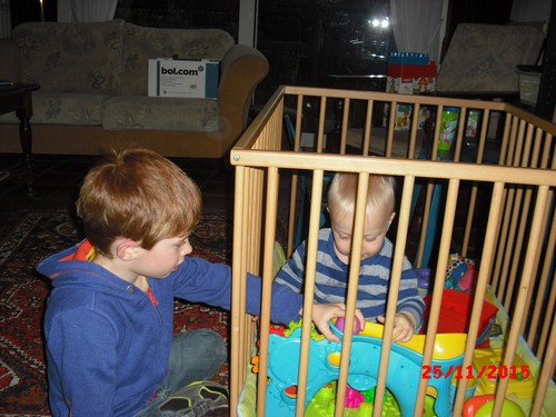 tR naar huis, Bart en Chris spelen even samen met de ballenbaan, dan gaat Bart verder met z'n kleurplaat en letters schrijven. Na 20 min, is papa er, Chris mag rondkruipen, Bart bij papa op schoot. Kleine donder kruipt weer razendsnel naar de keuken, ik er achter aan en probeer hem terug te laten lopen: dat vindt hij geen onverdeeld genoegen, gaat hem te langzaam, linkerbeen werkt nog niet goed mee.