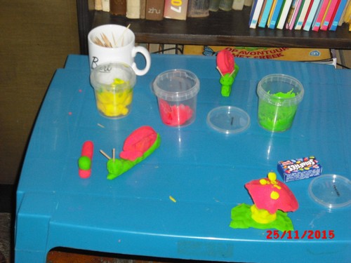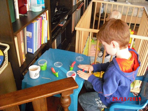 Gauw eten, Bart is traag, door het eten gaat hij nog meer hoesten, kokhalst er af en toe van, eet toch 2 boterhammen en een ½ mandarijn. Chris in de box waar hij met een rood hoofd staat te persen, dan gaat hij spelen. Bart even bij tR op schoot terwijl ik afruim. Bart speelt even met Chris en komt dan tegen me aanhangen, voelt warm, geen pufjes of paracetamol in de tassen, ik kijk het wel even aan. We spelen een paar spelletjes op de tablet: cijfers, letters, vormen en woordjes maken. Na een kwartier wil Bart niet meer, is moe. Zullen we een slak maken van klei? "Jaaaa", samen maken we een slak, Bart kijkt goed wat ik doe en maakt een mooie slak, daarna een paddestoel, die maakt hij zonder hulp.