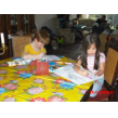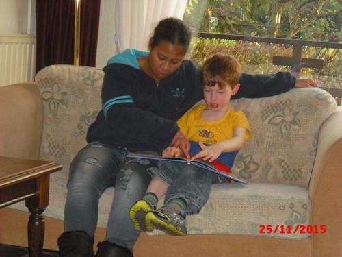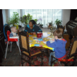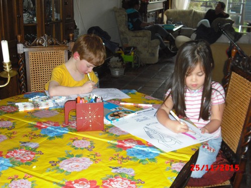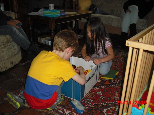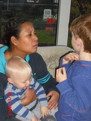 Liu en tR gaan weer naar huis, de twee kleuters geven elkaar stevige afscheidsknuffels. Dan leest tR een tipboek voor. Na een kwartier Chris halen en pap eten, Bart ook aan tafel verder kleuren en z'n naam proberen te schrijven, 't lukt al aardig. Pap bijna op en Chris en Bart knuffelen even met tR, dan Chris in de box, Bart en ik doen nog even een boerderijspelletje.