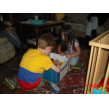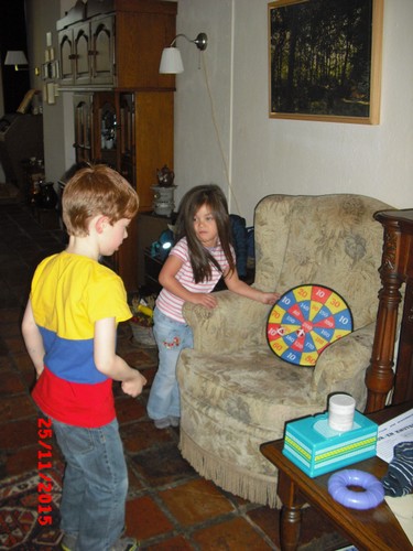 Pauze met sap en smarties, dan gaan ze darten, Bart doet het voor, Liu probeert het ook even maar verliest al gauw haar belangstelling. Samen besluiten ze dat ze gaan legoën, ze sjouwen samen de doos naar het kleed en gaan bouwen/babbelen.