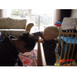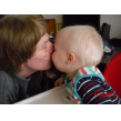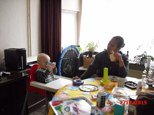 Thuis, lekker eten, Chris een liga en ontdekt dat hij kan drinken uit z'n tuitbeker als we hem niet meer helpen: merkt dat hij de beker dan zelf omhoog moet houden! Bart eet rustig maar wantrouwt de mandarijn waar ik pitjes heb uitgehaald, verkeerde mandarijn in het netje, was ook wel heel erg groot en daarom koos Bart hem uit. En Chris wil graag knuffelen!