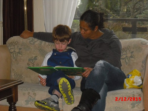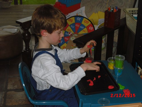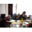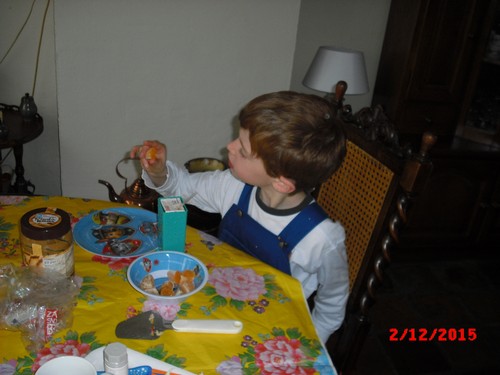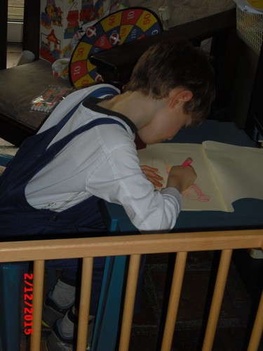 Chris een schone luier en naar boven, ligt eerst wat te jengelen en in z'n ogen te wrijven maar valt al gauw in slaap. Bart wil een spelletje op de tablet, nee baasje, eerst een werkje maken, hij kiest z'n Sintboek en gaat de stoomboot inkleuren. Is rustig aan het werk en babbelt weinig, na 20 min: "nu ga ik kleien" en is daar een kwartiertje mee bezig. Dan sap en koek, Bart vertelt welke pieten er allemaal zijn. Ik zet de Sint-cd op maar da's niet zo'n goed idee want Bart wordt daar na een tijdje wat stuiterig van en wil knokken met tR. 2 tipboeken lezen en dat helpt. Daarna even z'n klei opruimen, hij sputtert wat maar gaat overstag wanneer ik zeg dat anders de klei uitdroogt.