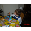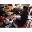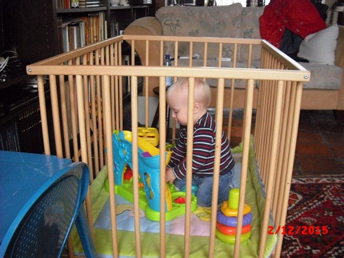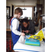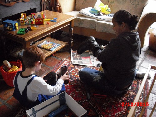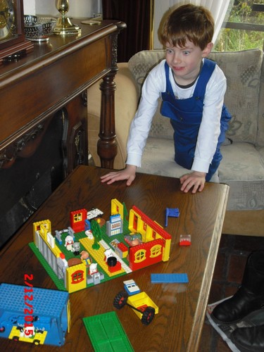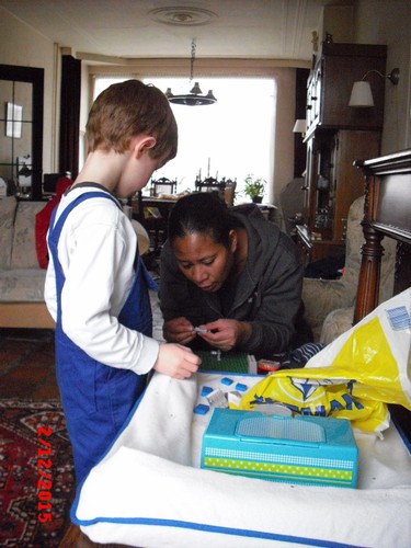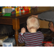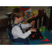 Chris in de box spelen en Bart en tR gaan aan de slag met de Plus-winkel-lego van tR en bouwen een winkel met schappen. poortjes en kassa. Bart met fantasie voegt daar allerlei dingen aan toe. Na een ½ uur gaan ze samen de laarzen van tR poetsen.