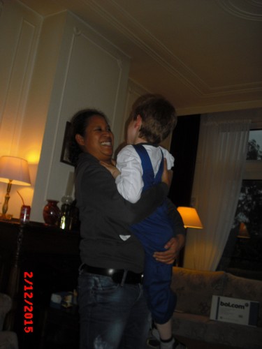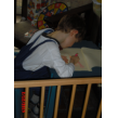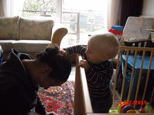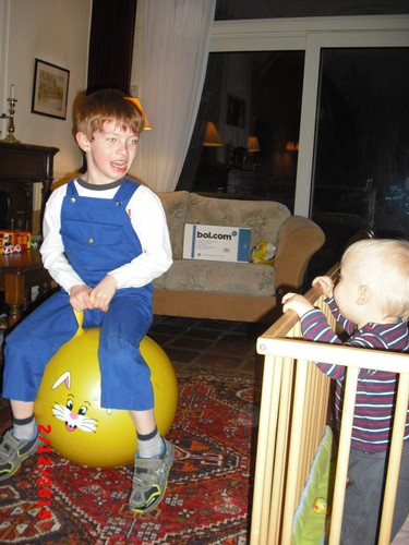Chris halen en pap eten. Z'n neus zit potdicht en hij heeft daarom veel moeite met eten, maar na een paar keer flink snotteren, gaat het beter. Dan even rondkruipen terwijl Bart en ik 20 min. spelletjes doen op de tablet. Dan Chris in de box en tR naar huis. Bart wil gaan 'vliegen', maar dat wil ik niet, je mag wel skippiën. Hij probeert in 2 sprongen van bank naar bank te komen, daarna heel hoog springen op 1 plek. Chris schatert en wipt mee met Bart z'n sprongen.