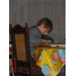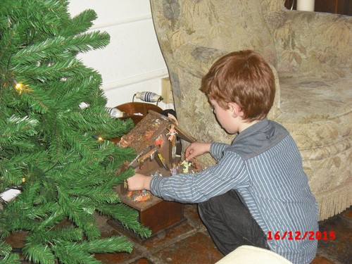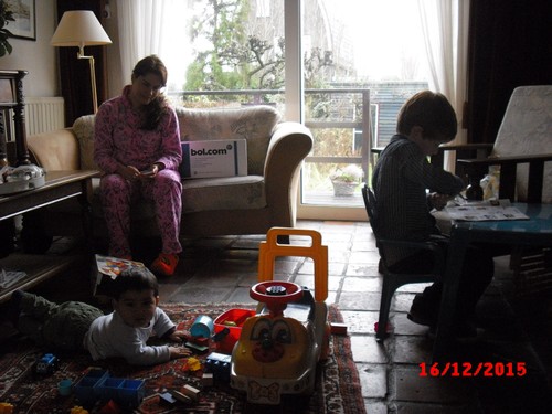 Tafel afruimen en dan zet Bart z'n tafel en stoel op z'n plek, bekijkt uitgebreid de kerststal en vertelt wie er allemaal in staan: "dat is Maria . . en Jozef . . en de baby . . en Herodes . . (nee die was er niet bij) . . en Baltosoor (Balthasar bedoel je) en ook Baltosoor . . en een ezel . . . en een elfje . . (een engel) ja en dat is de voerbak . . ". Uitgekeken en naast me op de bank, waar wil je mee spelen? "weet ik even niet", we babbelen dus verder over de 'nepper', het samen versieren zodra alle lampjes er in hangen en nog een keer over de mooie bal die hij per ongeluk kapot liet vallen, duidelijk een klein trauma.