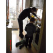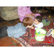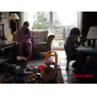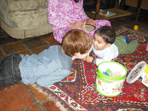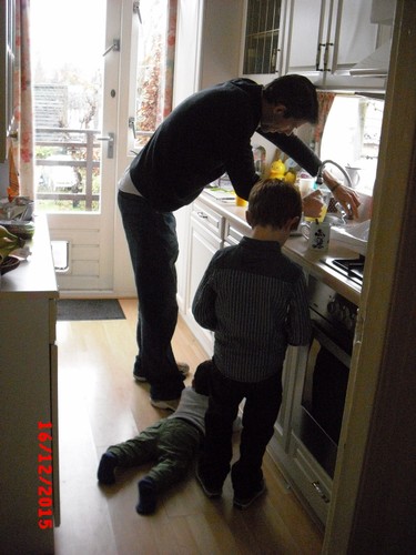 B/A/P komen naar beneden, Bart gaat met baby op het kleed, geeft nederlandse les aan tA, pakt allerlei dingen, noemt de naam en tA zegt hem na, kleine neef kijkt hem bewonderend aan vanaf z'n zeehondhouding. Daarna even spelen met kleine neef totdat die z'n fruithap krijgt. Bart gaat dan met blokken een kasteel bouwen en kerstdingen knippen uit folders, houdt steeds onrustig in de gaten wanneer kleine neef weer 'beschikbaar' is maar die wil geen fruithap en krijgt wat anders, dan maar even een tip-boek lezen, "over de kerst". Hèhè, kleine neef eindelijk weer op het kleed, Bart maakt z'n knipsel af en speelt weer even met Pietertje.