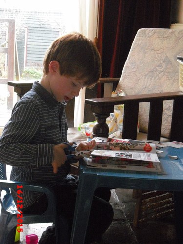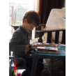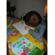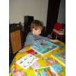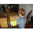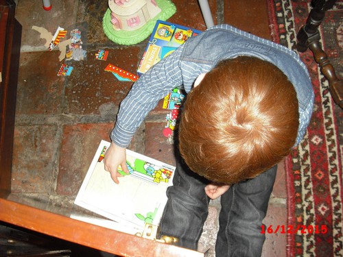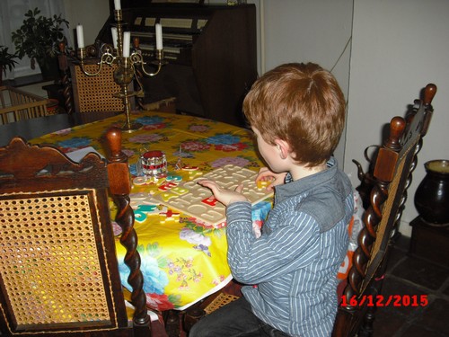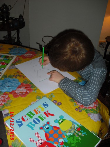Hij is nu een uur bezig! Even tijd voor sap/koekjes en babbelen, dan vraagt hij of ik een kerstboom kan tekenen, dan kan hij die overtrekken en inkleuren, weer aan tafel bezig. Na een kwartier tekening in de boekenkast en nog net tijd voor tabletspelletjes: tellen en geheugen.