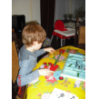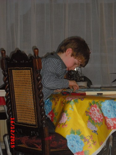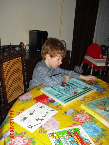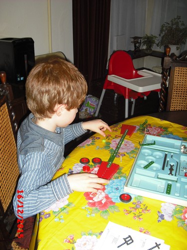 Naar hofstede, eerst alle kerststallen bekijken, noemt de namen van de poppetjes, dan lampjes en een bal zoeken, Bart kiest een rood-zilveren trommeltje dat niet kan breken en in de kerstboom kan. Na een half uurtje zijn we weer thuis, even een lola-dvd kijken, baby kijkt mee en wiegt mee op de muziek. Dan is het tijd voor weer een babyslaapje, Bart: "ik weet het even niet" en hangt weer naast me op de bank, "oma, mag ik een snoepje?", niks hoor, eerst een werkje maken of een puzzel of zoiets, kijk maar in je kast wat je wil doen. Hij kiest z'n alfabetpuzzel en zegt keer op keer bijna goed het alfabet op, volgende puzzel, da's een hele moeilijke en alle stukjes vallen ook nog op de grond. Die uitdaging kan Bart niet weerstaan en hij gaat aan de slag, een voorbeeld is er niet, hij begint op de grond waar de puzzel gevallen is maar ik laat hem al gauw aan tafel zitten voor een beter overzicht, baas is 20 min. bezig. Gelukt! Dan pakt hij de meccano, het is stil in de kamer, geen cd op, Bart heel geconcentreerd aan het 'bouwen', het resultaat is een futuristisch apparaat.