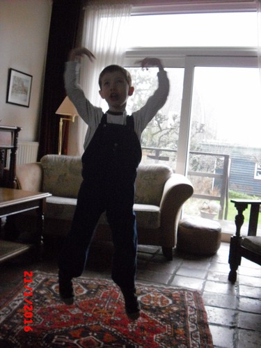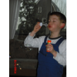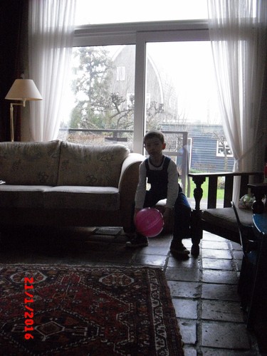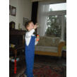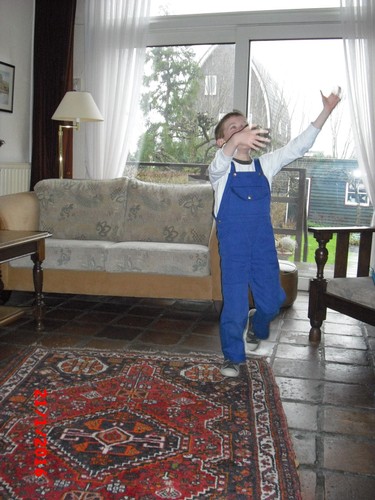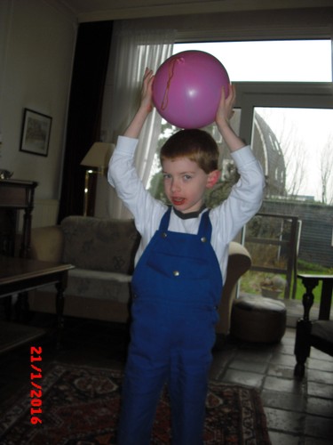 "Lin was jarig, kijk ik heb een ballon en een fluitje en een bellenblaas . . ook een lolly" Doe maar terug in het tasje Bart dan raakt het niet kwijt. Dan springt en rent hij naar de auto. Onderweg heeft hij het te druk om te kletsen: toeteren op z'n fluitje en proberen ballon op te blazen maar dat laatste lukt hem niet, verder met fluitje. Na een kwartier zijn we thuis en fluitje is doorweekt, eerst maar m'n oren ontlasten dus sap en koekjes op de bank. Ondertussen babbelen: heeft Denley nog raar gedaan? "ja hij deed de punt van een boek in mijn been, toen moest ik huilen en ik pakte zijn arm, kijk zo, en toen moest hij ook huilen . . we gingen naar de juf . . die zei dat we het niet goed hadden opgelost . . Denley wou geen sorry zeggen . . nee ik ook niet . . hij had het gedaan . . . toen zeiden we wel sorry". Denley doet nog een beetje als een peutertje, "maar hij is al 4", maar soms lijkt hij wel 3, "ja of 2 of 0 . . . hij ruikt soms een beetje vreemd (??) een beetje vies . . als hij nieuwe kleren aan heeft" ojé, heb je nog buiten gespeeld? "ja . . Jen, da's een meisje uit groep 2 botste tegen mijn neus (?) nee ik ging niet huilen, was niet zo erg . . . (?) ja de juf heeft voorgelezen over meester Bart . . dat was grappig".