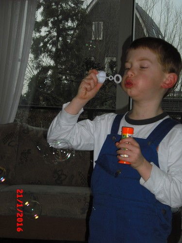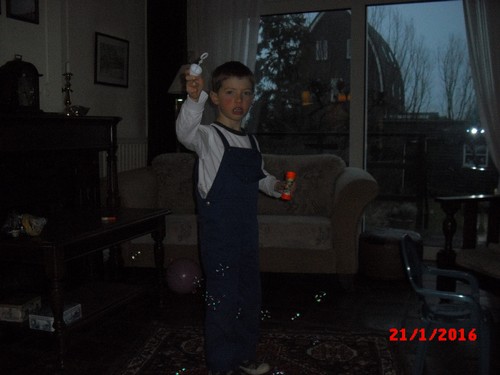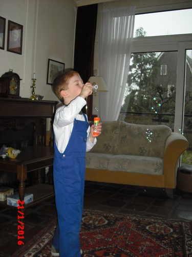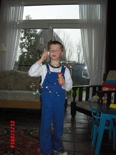 "Oma mag ik een spelletje?" Speelt trein-, vormen- en doolhofspelletjes en "oma ik heb een snottebel". Na een half uurtje is het genoeg, gaat verder met bellenblaas, neus nu potdicht. Ontdekt dat hij door met z'n arm heen en weer te zwaaien een heleboel bellen maakt: "het lijkt wel een ballenverkoping" en probeert ze op te vangen. Heeft dan nog een idee: "ik pak de vliegenmepper, kijken of ik ze kapot kan slaan".